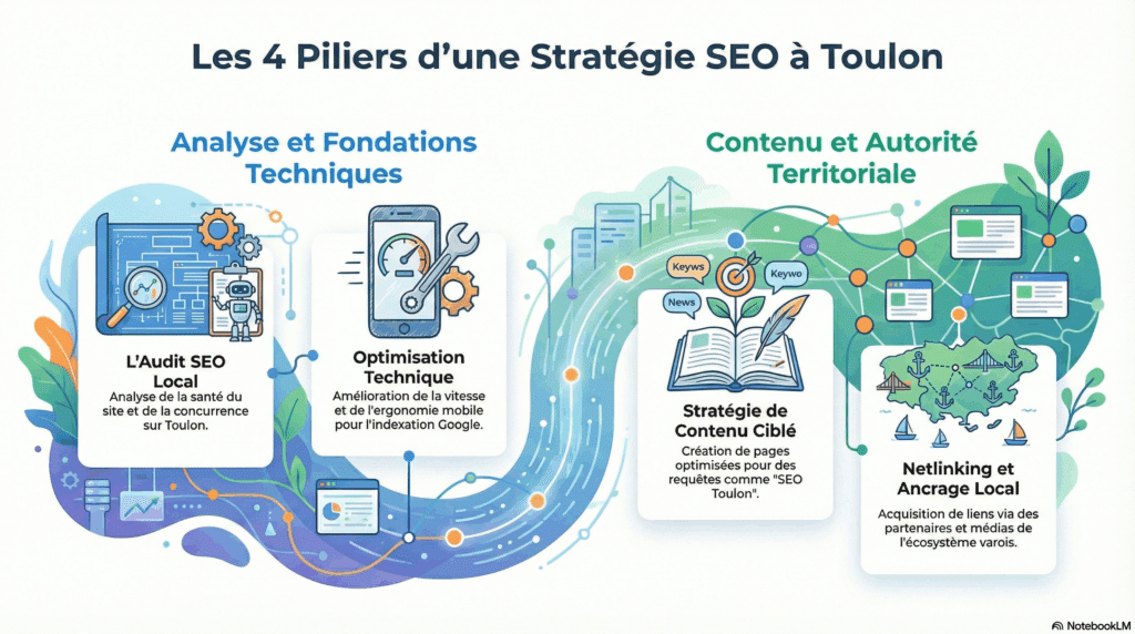 Dans le Var, cela passe souvent par des contenus géolocalisés : pages services, pages locales, articles informatifs ou comparatifs ciblant des requêtes comme “SEO Toulon”, “référencement Toulon” ou “agence SEO à Toulon”.